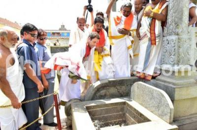 Event Description : AICC President Rahul Gandhi offered pooja at Sringeri Sharada during Congress “Janashirvada Rally”, also seen are Chief Minister of Karnataka Siddaramaiah and K C Venugopal, Karnataka In charge, in Sringeri on Wednesday 21st March 2018