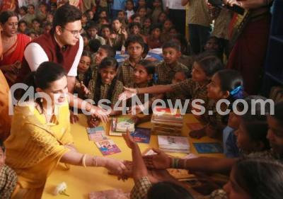Photo Caption : Yaduveer Krishnadatta Chamaraja Wadiyar with his wife Trishika Kumari interacting with Government school students during the inauguration of “Jnanalaya†Government school library project at Byatarayanapura, sponsored by “Kalisu†foundation, in Bengaluru on Wednesday 21st March 2018
