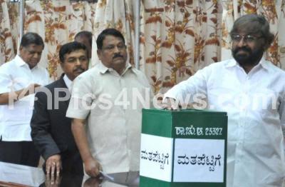 Photo Caption : Minster Eshwar Khandre and MLAs casting their votes at the Polling booth during Rajya Sabha elections at Vidhana Soudha, in Bengaluru on Friday 23rd March 2018