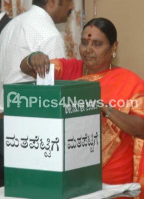 Photo Caption : BJP MLA Ramakka casting her vote at the Polling booth during Rajya Sabha elections at Vidhana Soudha, in Bengaluru on Friday 23rd March 2018