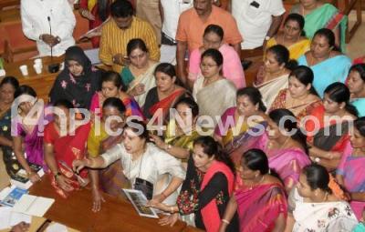 Photo Caption : Women Councilors protesting during BBMP Council meeting at BBMP office, in Bengaluru on Friday 23rd March 2018