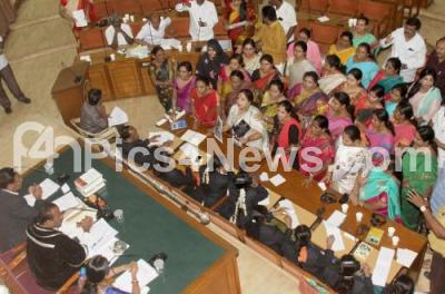 Photo Caption : Women Councilors protesting during BBMP Council meeting at BBMP office, in Bengaluru on Friday 23rd March 2018