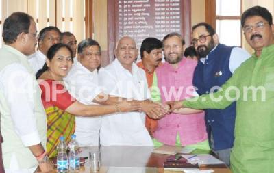 Photo Caption : BJP Rajya Sabha candidate Rajiv Chandrashekar being greeted by BJP State President BS Yeddiyurappa, Union Minister Prakash Javedkar and BJP state leaders at Vidhana Soudha, in Bengaluru on Friday 23rd March 2018