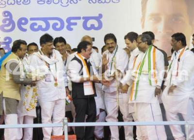 Photo Caption : JDS rebel MLAs Zameer Ahamed Khan, Balakrishna joined congress party also seen are AICC President Rahul Gandhi with Chief Minister Siddaramaiah, KPCC President Dr G Parameshwara, Congress State Leaders Mallikarjuna Kharge, D K Shivakumar, Dinesh Gundu Rao and others during congress “Janashirvada Rallyâ€, in Mysuru on Sunday 25th March 2018