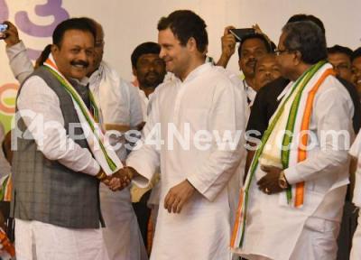 Photo Caption : JDS rebel MLA N Cheluvarayaswamy joined congress party also seen are AICC President Rahul Gandhi with Chief Minister Siddaramaiah, KPCC President Dr G Parameshwara, Congress State Leaders Mallikarjuna Kharge, D K Shivakumar, Dinesh Gundu Rao and others during congress “Janashirvada Rallyâ€, in Mysuru on Sunday 25th March 2018