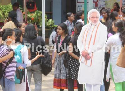 Photo Caption : Students walking past the banner of PM Narendra Modi during the Inter College Festival at Maharani Lakshmi Ammani Womens College, Malleshwaram, in Bengaluru on Monday 26th March 2018