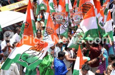 Photo Caption : Congress workers seen with party flags at KPCC office, in Bengaluru on Tuesday 27th March 2018
