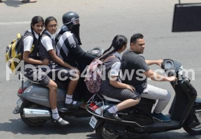 Triple riding by 2 wheeler riders without helmets at Queens Road, in Bengaluru on Tuesday 27th March 2018