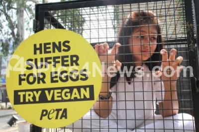 PETA activists caged themselves in solidarity with Hens used for Eggs during a demonstration at Brigade Road Junction, in Bengaluru on Wednesday 28th March 2018