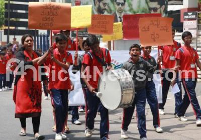Photo Caption : School students participated in Election Awareness Campaign, urging people to vote in the upcoming Assembly Elections at Nagarbhavi, in Bengaluru on Wednesday 28th March 2018