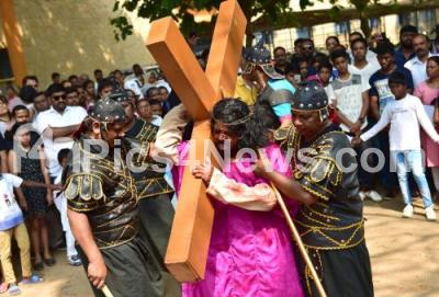 Photo Caption : Christian devotees enact scenes from the crucifixion of Jesus Christ on the Eve of Good Friday, at St Francis Xaviers Cathedral Church, in Bengaluru on Friday 30th March 2018