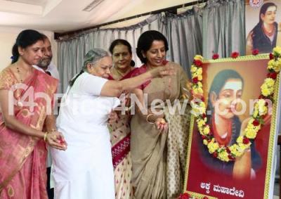 Photo Caption : Susheelamma, President, Sumangali Sevashrama with Mukta Kagali, K V Nagarajamurthy and others offering floral tribute to Shiva Shiva Sharane Akkamahadevi portrait during her jayanti celebrations at Chintana Mantapa, Jayanagar, in Bengaluru on Saturday 31st March 2018