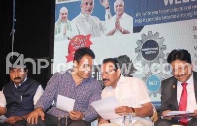 Union Minister V Sadananda Gowda with MLA Ashwatha Narayana, K Ravi, President, FKCCI during BJP MSME meeting at KASSIA, in Bengaluru on Sunday 1st April 2018
