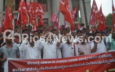 Photo Caption : Members of CITU staged a protest against the anti labour policies of the central government at Town Hall, in Bengaluru on Monday 2nd April 2018