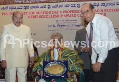 Photo Caption : Dr D Veerendra Heggade, Dharmadhikari being felicitated by Dr MR Doreswamy and others during the Professor CNR Rao and Professor MRD Merit Scholarship Award Ceremony on the occasion of PES University Foundation Day program at PES University, in Bengaluru on Wednesday 4th April 2018