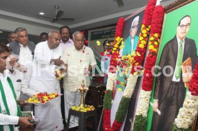 Photo Caption : JDS Surpemo HD Devegowda with JD S leaders PGR Sindhia and others offering floral tribute to portrait of Late Dr Babu Jagjivan Ram, former Deputy Prime Minister, to mark his 111th Birthday Celebrations at party office, in Bengaluru on Thursday 5th April 2018