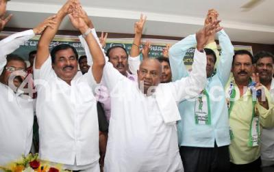 Photo Caption : Kolar District Srinivasapura Assembly constituency congress leaders led by Former MLA G K Venkatashiva Reddy joined JDS party in the presence of JDS Surpemo H D Devegowda at party office, in Bengaluru on Thursday 5th April 2018