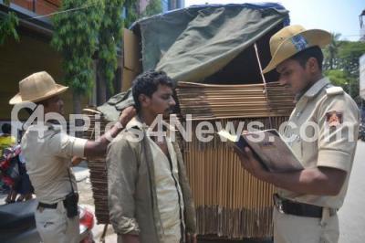 Photo Caption : Policemen on election check post duty, seen checking goods vehicles stringently, to keep a check on illegal transportation of cash, liquor and other items to woo voters ahead of the Karnataka Assembly Elections at Double Road, in Bengaluru on Thursday 5th April 2018