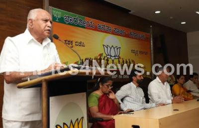 Photo Caption : BS Yeddyurappa, BJP State President, addressing in the presence of MLA Suresh Kumar, MP Shobha Karandlaje and others during the BJP Foundation Day programme at BJP Office, in Bengaluru on Friday 6th April 2018