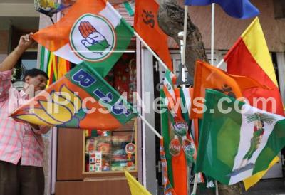 Event Description : A shopkeeper seen arranging the All Party Election Campaigning material at Nagarbhavi for the upcoming Karnataka Assembly Election, in Bengaluru on Saturday 7th April 2018