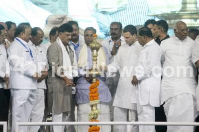 Event Description : AICC President, Rahul Gandhi seen with CM Siddaramaiah, KC Venugopal and other Congress leaders inaugurated the Congress Rally “ Jana Ashirwada Yatra” at Palace Grounds, ahead of the Karnataka Assembly Elections, in Bengaluru on Sunday 8th April 2018