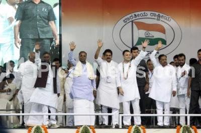 AICC President, Rahul Gandhi seen with CM Siddaramaiah, KC Venugopal and other Congress leaders inaugurated the Congress Rally “ Jana Ashirwada Yatra” at Palace Grounds, ahead of the Karnataka Assembly Elections, in Bengaluru on Sunday 8th April 2018