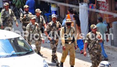 CRPF personals on a road march at Uttarahalli following the Karnataka Assembly elections, in Bengaluru on Tuesday 10th April 2018