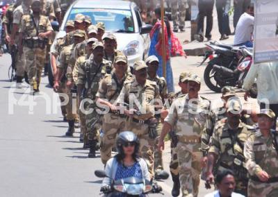 Photo Caption : CRPF personals on a road march at Uttarahalli following the Karnataka Assembly elections, in Bengaluru on Tuesday 10th April 2018
