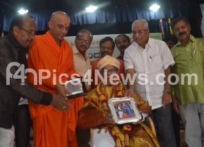 Photo Caption : Sri Nirmalananda Swami of Adichunchanagiri Mutt with Justice Gopalagowda and others felicitated Dr Doddarangegowda and released his books during a program at Kannada Sahitya Parishat, organised by Vishwa Okkaligara Mahavedike, in Bengaluru on Tuesday 10th April 2018
