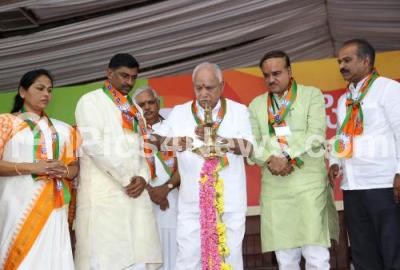 Event Description : BJP State President BS Yeddyurappa with Union Minister Ananth Kumar, BJP in charger Muralidhar Rao, MPs Shoba Karandlaje and PC Mohan at the inauguration of workshop to introduce the poll plan for the elections at Palace Grounds, in Bengaluru on Wednesday 11th April 2018