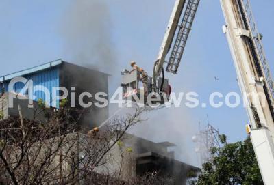 Photo Caption : Fire personnel douse the fire which had caught at a hardware shop at Narasimha Raja Road near SJP Park, in Bengaluru on Wednesday 11th April 2018