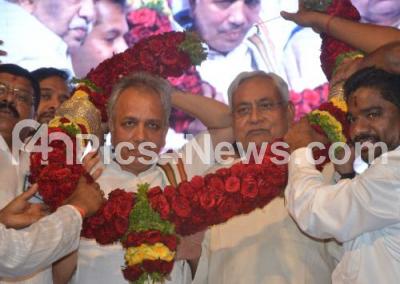 Photo Caption : Chief Minister of Bihar and JDU National President, Nitish Kumar being felicitated by Mahima J Patel, JDU State President Karnataka, RCP Singh, JDU National Secretary and party workers during the JDU Karnataka workers meet at Chowdaiah Memorial Hall, in Bengaluru on Wednesday 11th April 2018
