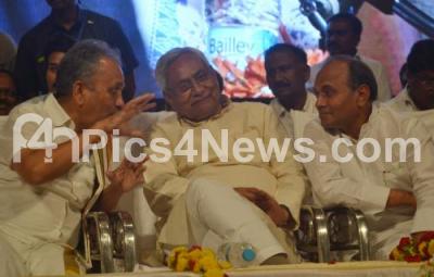 Photo Caption : Chief Minister of Bihar and JDU National President, Nitish Kumar seen with Mahima J Patel, JDU State President Karnataka, RCP Singh, JDU National Secretary and at the JDU Karnataka workers meet at Chowdaiah Memorial Hall, in Bengaluru on Wednesday 11th April 2018