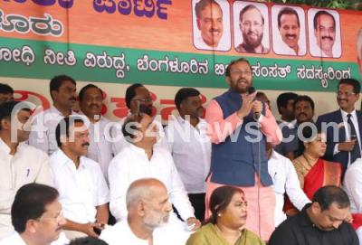 Union Ministers Prakash Javadekar with DV Sadananda Gowda, Ananth Kumar, MPs P C Mohan, MLAs R Ashoka and BJP leaders and supporters participated in hunger strike to protest against the washout of the second part of Parliament budget session due to continuous disruptions by opposition parties, the protest was held at Gandhi Statue, Anand Rao Circle, in Bengaluru on Thursday 12th April 2018