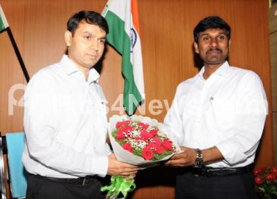 Photo Caption : Darpan Jain, New Deputy Commissioner of Mysuru being welcomed by the outgoing Deputy Commissioner of Mysuru, KB Sivakumar, in Mysuru on Tuesday 17th April 2018
