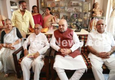 Photo Caption : BJP National President Amit Shah interacting with Kannada writer, researcher and historian Dr Chidananda Murthy during his visit to Chidananda Murthy residence, also seen BJP State President B S Yeddyurappa at Hampi Nagar, in Bengaluru on Wednesday 18th April 2018