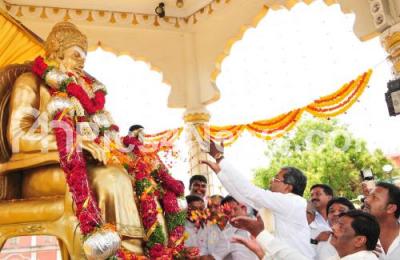 Photo Caption : CM Siddaramaiah garlanding the statue of Basaveshwara on the occasion of Basaveshwara Jayanti in Mysuru on Wednesday 18th April 2018