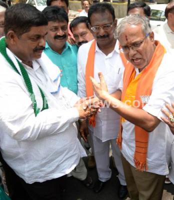 Photo Caption : JDS Mahalakshmi Layout Candidate Gopalaiah and BJP Rjajajinagar MLA Candidate Suresh Kumar greeting each other during their nomination filing at BBMP office, RTO Office, Rajajinagar, in Bengaluru on Friday 20th April 2018