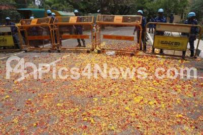 Photo Caption : Flowers thrown everywhere during Yeshwanthpur MLA Candidate from Congress ST Somashekar filed his nomination at BBMP office, Herohalli, in Bengaluru on Friday 20th April 2018