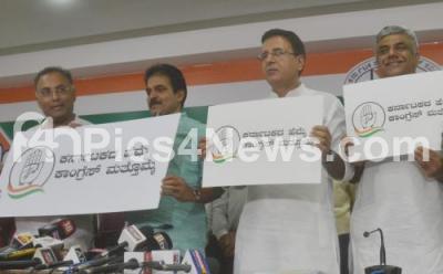 Photo Caption : Randeep Singh Surjewala, Head of AICC Communication Dept with KC Venugopal, Congress Karnataka in charge, Dinesh Gundu Rao and others unveiled the Congress Election Campaign logo at KPCC, in Bengaluru on Tuesday 24th April 2018