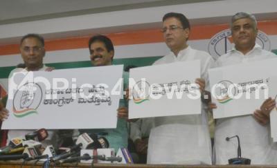 Photo Caption : Randeep Singh Surjewala, Head of AICC Communication Dept with KC Venugopal, Congress Karnataka in charge, Dinesh Gundu Rao and others unveiled the Congress Election Campaign logo at KPCC, in Bengaluru on Tuesday 24th April 2018