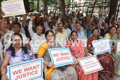 Photo Caption : Members of Coffee Board Pensioners Association protesting and demanding immediate revision of pension of Pre 2006 Pensioners of coffee board, at Coffee board premises, in Bengaluru on Wednesday 25th April 2018