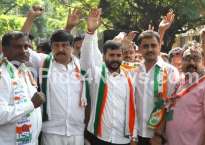 Photo Caption : Congress Mahalakshmi Layout Candidate HS Manjunath with his supporters seen during election campaign for the Assembly election at Navarang, Mahalakshmi Layout in Bengaluru on Thursday 26th April 2018