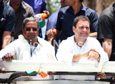 Photo Caption : AICC President Rahul Gandhi and CM Siddaramaiah at the road show for the upcoming assembly election, in Ankola on Thursday 26th April 2018