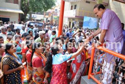 Photo Caption : Union Minister Ananth Kumar seen interacting with the people during his campaign for Satish Reddy, BJP candidate for Bommanahalli assembly constituency, in Bengaluru on Saturday 28th April 2018