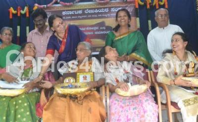 Photo Caption : Vanamala Sampannakumar, President Karnataka women Writers association presenting "K T Banashankaramma" award to Chandrakala Nandavara, "Shobha Sundaresh and N D Sundaresh" award to K Tara Bhat , Soubhagya Babu and "Bhagya Nanjappa" award to Dr K S Pavitra, during award presentation programme at Kannada Sahitya Parishat, also seen are Dr KR Sandhya Reddy, S Divakara and others, in Bengaluru on Saturday 28th April 2018