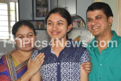 Photo Caption : 2nd PUC Science first rank student Kruti being greeted by her parents, after the 2nd PUC results were announced today all over Karnataka, in Bengaluru on Monday 30th April 2018