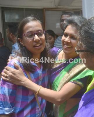Photo Caption : 2nd PUC Commerce first rank student, Varshini, being greeted by her teachers 2nd PUC results were announced today all over Karnataka, in Bengaluru on Monday 30th April 2018