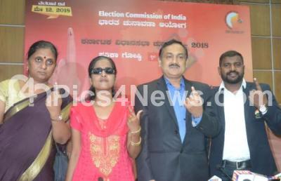 Photo Caption : Sanjiv Kumar, Chief Election Officer with Mamta, Joint Chief Election Officer, Mamata, Ashwini Angadi , Founder of Belaku Academy and HN Girish, Silver Medalist, London Paralympics seen during a Karnataka Assembly Election Campaign press conference, organized by Election commission at Vikasa Soudha, in Bengaluru on Monday 30th April 2018