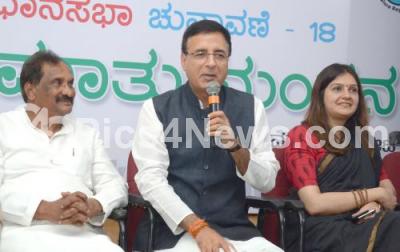 Photo Caption : Randeep Singh Surjewala, Head of AICC Communication Dept with BDTP Minister K J George and Congress National Spokesperson Priyanka Chaturvedi during a press conference at press club, in Bengaluru on Tuesday 1st May2018